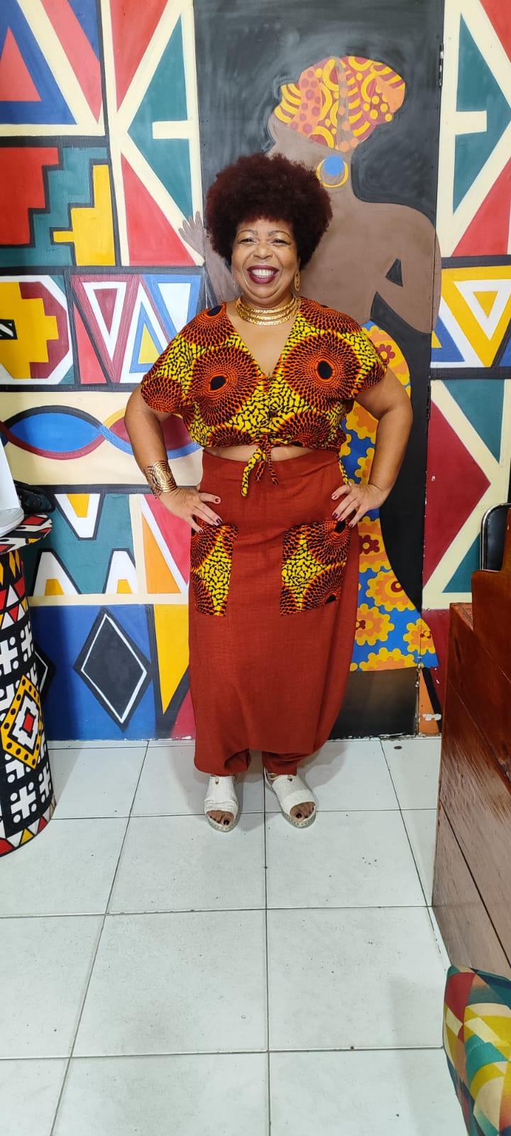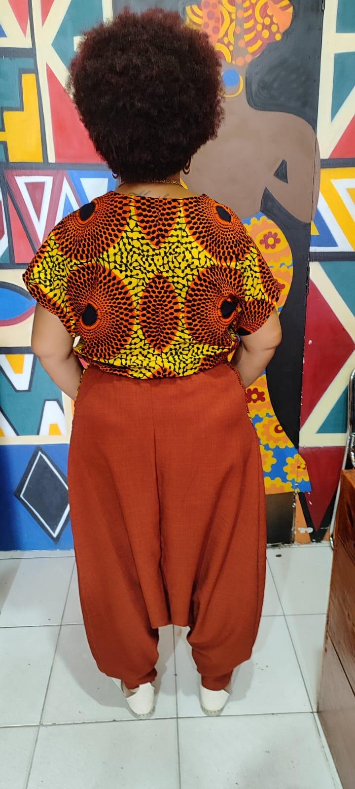 -Conjunto de Calça Saruel + Cropped em Tecido Africano